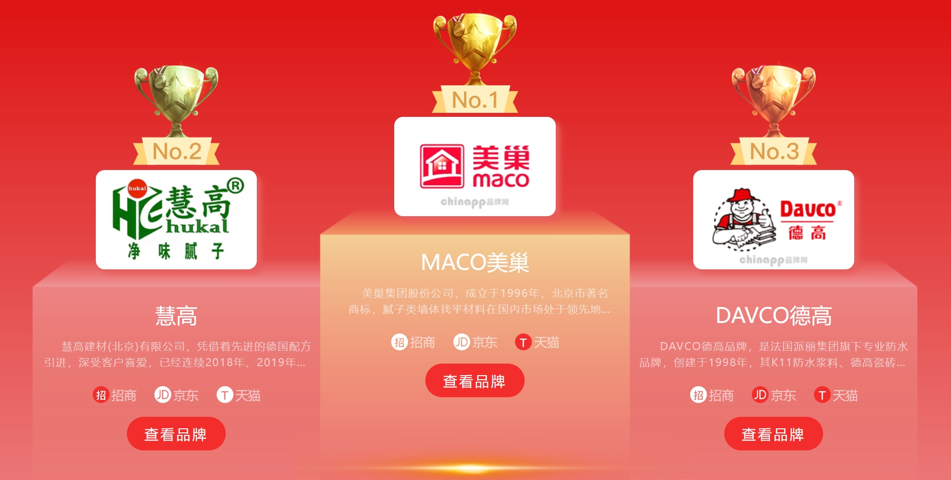 市場(chǎng)上排名比較靠前的膩?zhàn)臃燮放朴蠱ACO美巢、DAVCO德高、慧高、JAJANA家家安和Nippon立邦等。這些品牌當(dāng)中像DAVCO德高、Nippon立邦等都是耳熟能詳?shù)耐苛掀放?,所以?dāng)用戶(hù)陷入選擇迷茫的時(shí)候,這兩個(gè)牌子將會(huì)成為他們的首選項(xiàng)。因此,我們需要分析他們的優(yōu)勢(shì)所在。